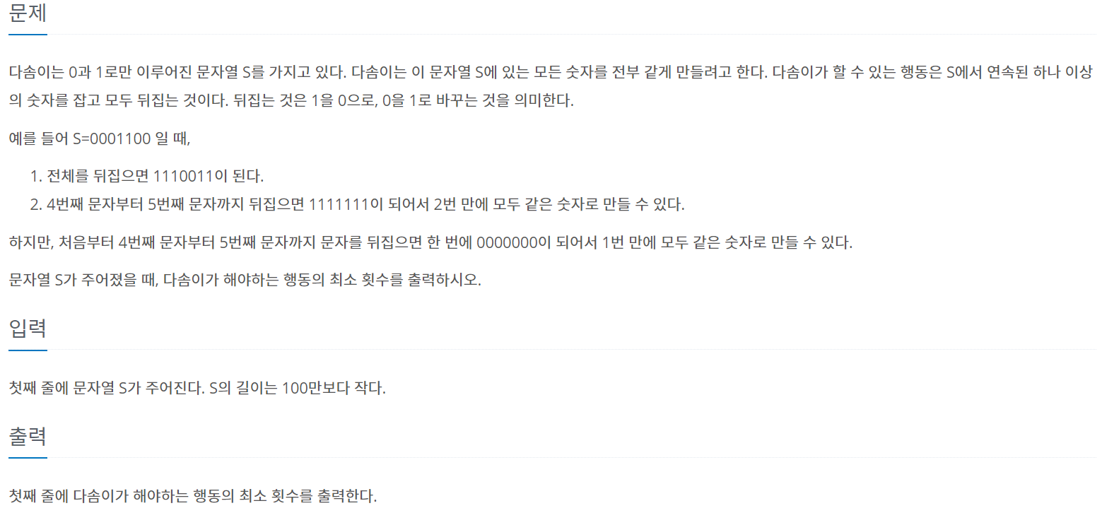 간단한 문제이다. 0이 나오는 영역과 1이 나오는 영역을 비교하여, 더 작은 영역을 출력하면 된다.