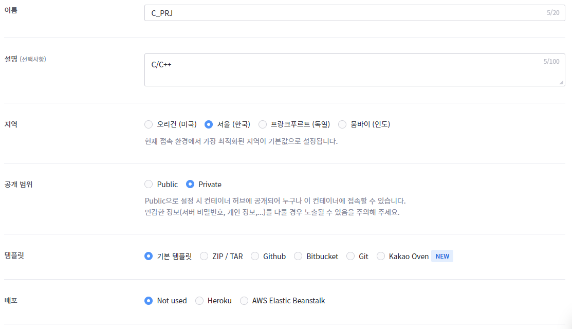 다음으로 컨테이너의 세부 정보 (이름, 설명, 공개 범위 등..) 를 입력해 준다.