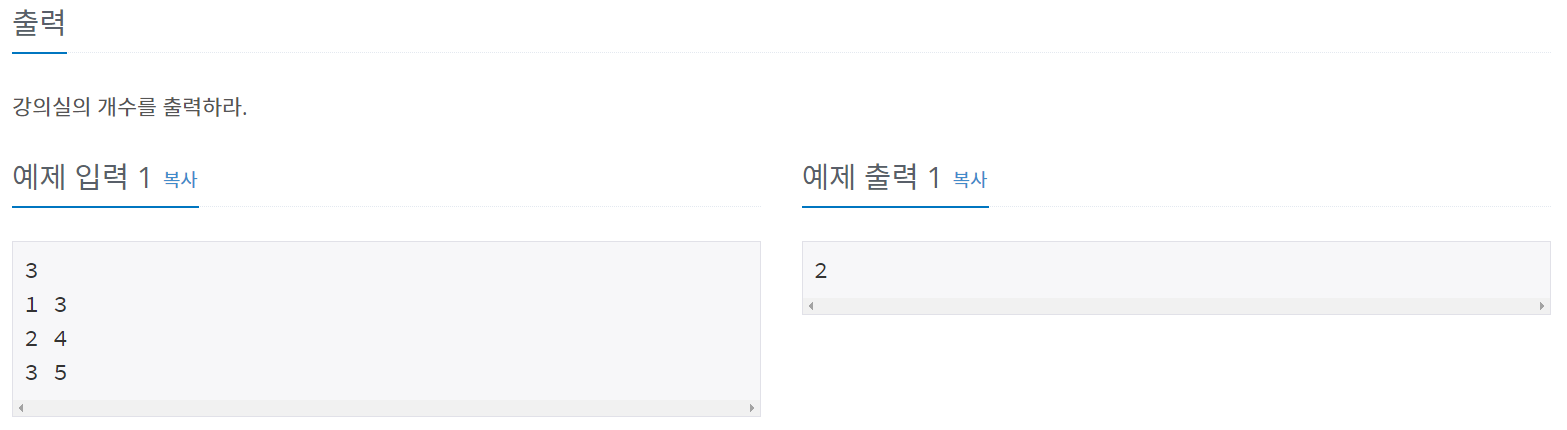 첫 번째 수업의 끝나는 시간(3)이 두 번째 수업의 시작 시간(2) 보다 크기에 강의실이 하나 더 필요합니다.