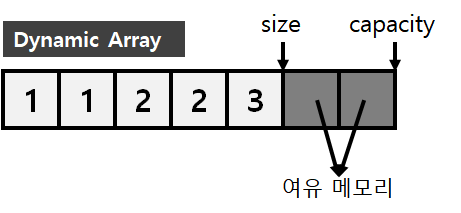 실제 원소의 수를 size , 여유 메모리를 포함한 할당받은 메모리의 크기를 배열의 용량 capacity 로 표현한다. 이렇게 여유 메모리를 미리 배열에 할당시켜 두면 append() 연산을 수행할 때 size의 값을 1 늘리고 그 위치에 새로운 값을 할당 시키기만 하면 된다.