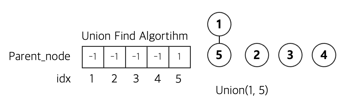 노드1과 노드5를 유니온 연산을 진행한다.