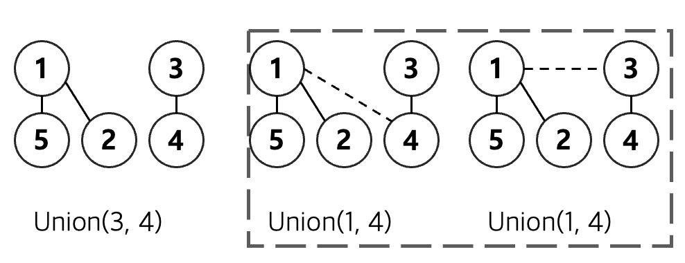 union(3,4) 연산까지는 지금까지 한대로 하면 되는데, union(1,4)에서 두 가지 케이스가 발생한다.