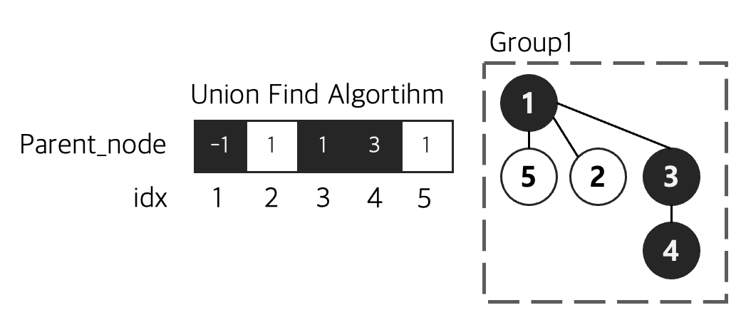 노드4의 그룹을 확인하고 싶다면 부모노드를 차례로 타고 올라가서 값이 -1인 노드 (루트노드)의 인덱스가 노드4가 속한 그룹 번호이다.