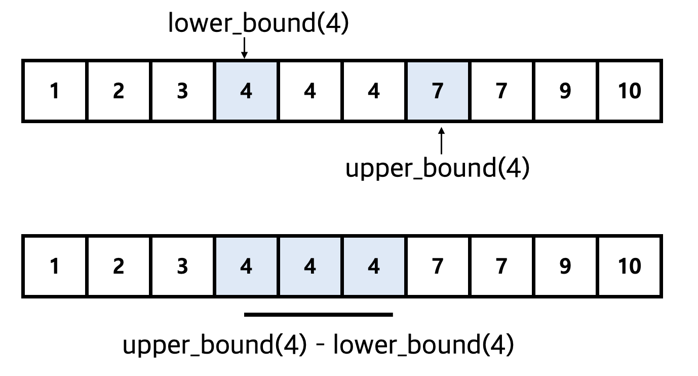 ▶upper_bound(4) (4 보다 큰 값이 등장하는 위치) 에서 lower_bound(4) (4가 처음으로 등장하는 위치) 의 값을 빼주면 원소 4의 개수가 출력된다.