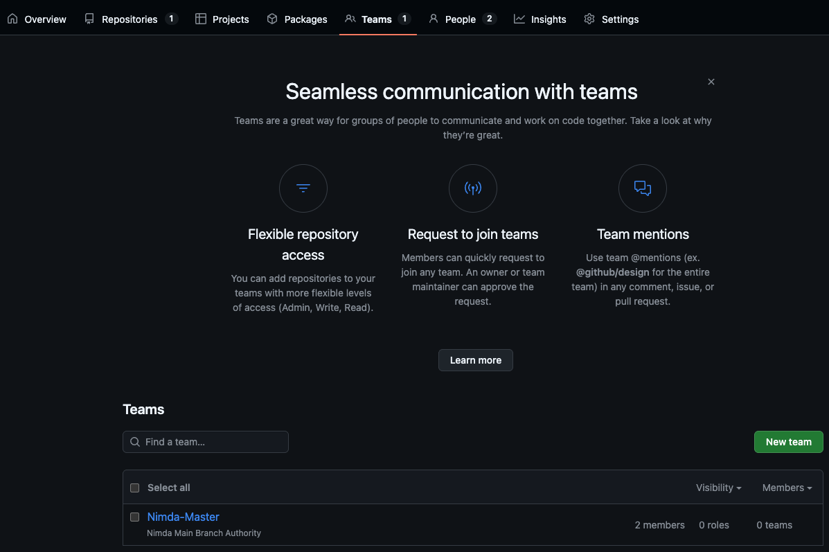 우선 Team Repository에 들어가 브랜치 규칙을 할당할 팀을 먼저 생성한다.