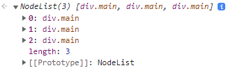 document.querySelectorAll 메서드로 class명이 main인 element에 접근을 시도하면 다음과 같이 nodeList를 반환합니다.