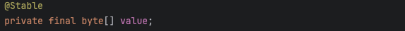 자바 언어에서 String은 불변 객체로 설계되어 있다. String 객체의 내부 코드를 보면 보면 문자열은 priavate final로 선언된 "문자의 배열" 형태로 정의 되어 있다. 예를 들어 "novDev" 라는 문자열은 실제로 'n', 'o', 'v', 'D', 'e', 'v' 라는 6개의 문자 배열로 구성된다. (JAVA9 버전 이후로는 byte 배열 형태로 바뀌었다.)