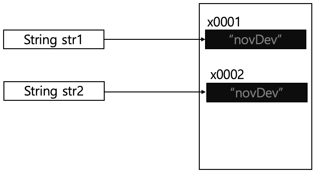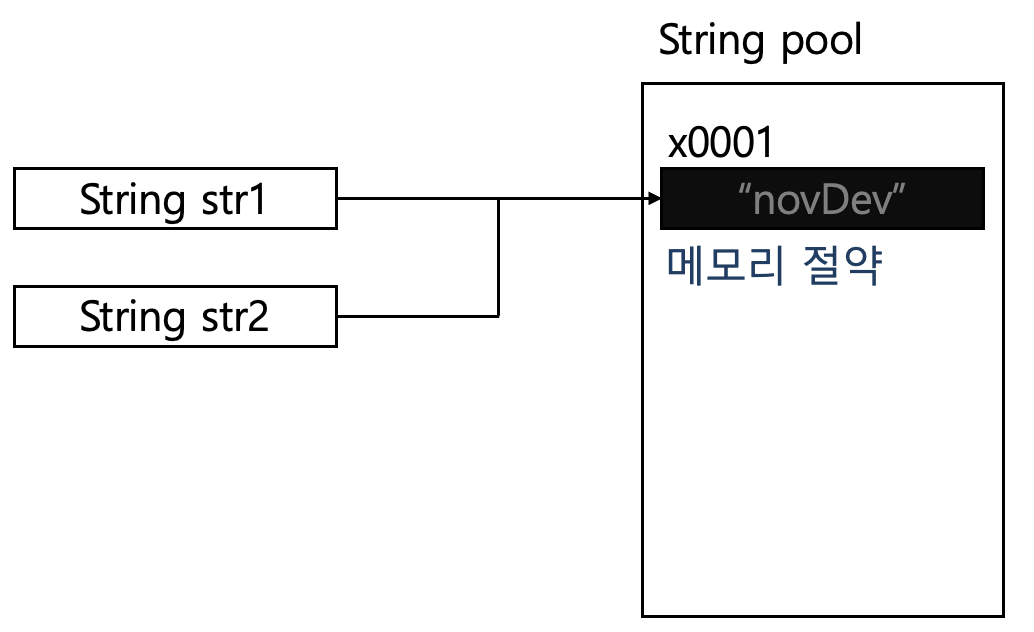 자바는 동일 값을 참조하는 인스턴스를 문자열 풀 이라는 공간에 메모리를 할당해 둔다.