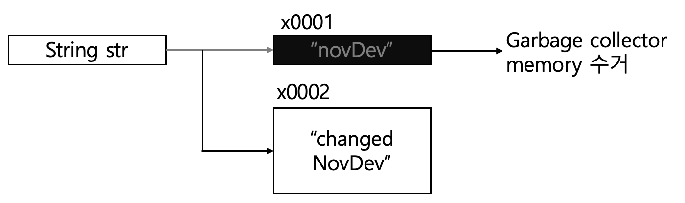 아래 코드를 보면 str 문자열 변수의 내부 값이 novDev에서 changedNovDev 문자열로 변경된 것 처럼 보이지만 실제로는 기존 값 ("novDev") 은 유지한 채 새로운 문자열 객체 ("changedNovDev") 를 생성한 뒤 반환하는 방식으로 동작한다.