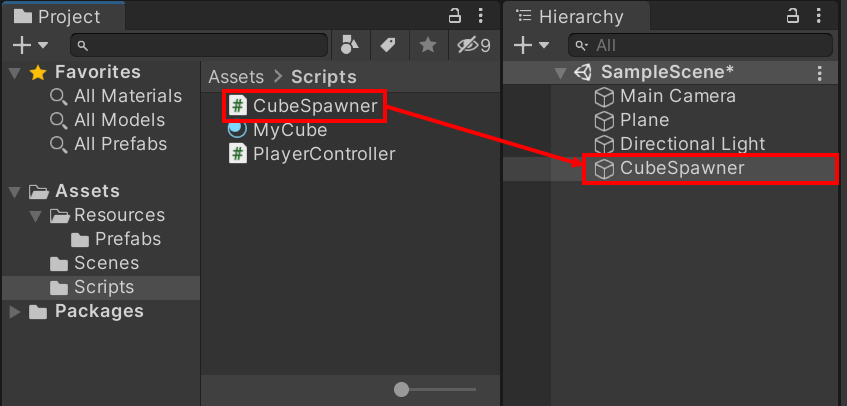 소스코드를 저장하고, CubeSpawner 빈 오브젝트에 스크립트 파일을 부착해 줍니다.