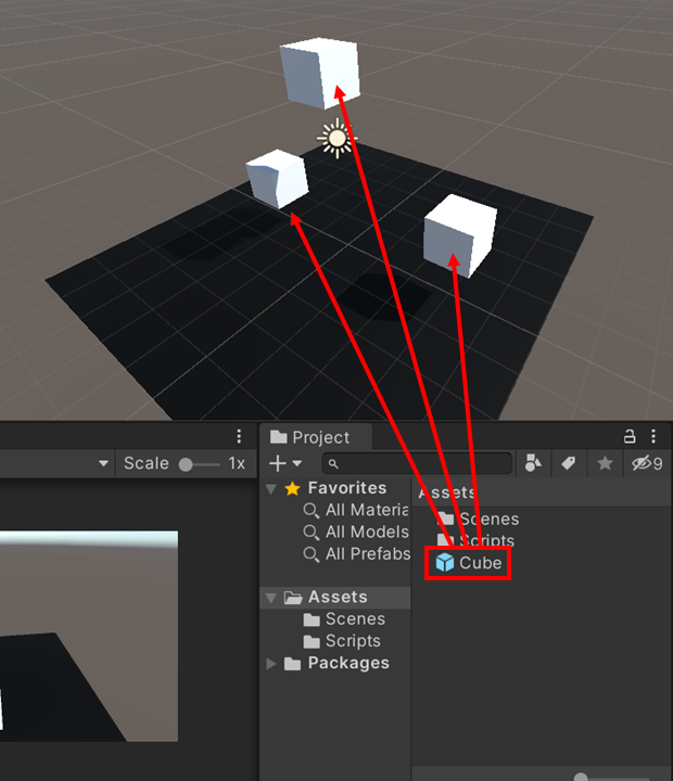 생성한 프리팹을 Scene으로 드래그 앤 드랍하면, 동일한 컴퍼넌트와 속성을 지닌 오브젝트가 여러개 생성됩니다. 이렇게 프리팹을 Scene에 배치하는 일련의 과정을 "프리팹의 인스턴스화" 라고 부릅니다.