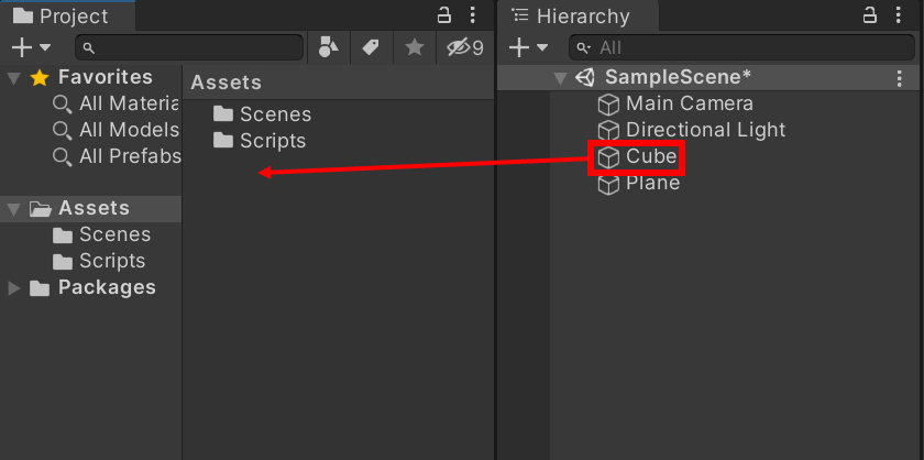 프리팹 생성 방법은 간단합니다. Hierarchy 창에서 프리팹으로 만들기를 원하는 오브젝트를 선택한 후, Assets 창으로 드래그 앤 드랍(Drag and Drop) 합니다.